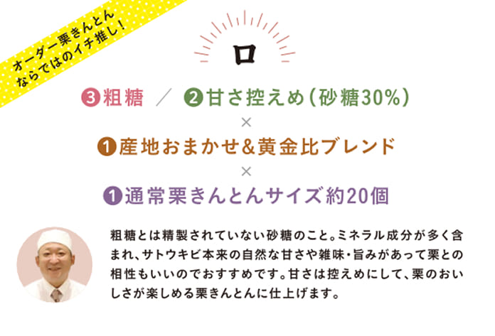 お客様のご都合の良いお届け日にあわせて炊き上げ、仕上げた栗きんとんをその日のうちに発送いたします。作りたてのおいしさをお届けしたくて、お日持ちが通常より短くなっております。