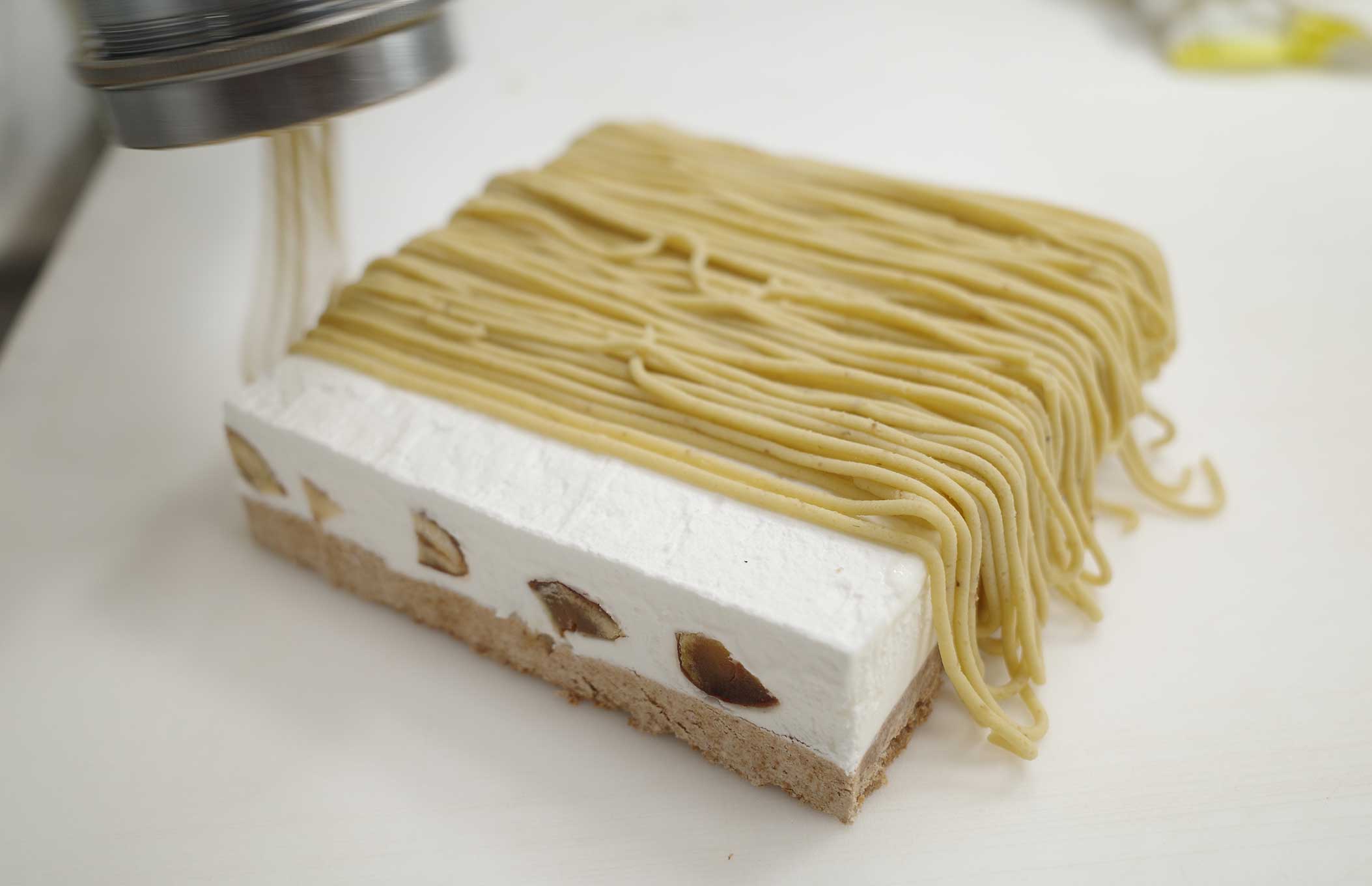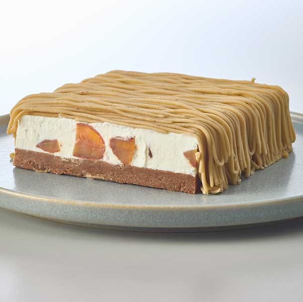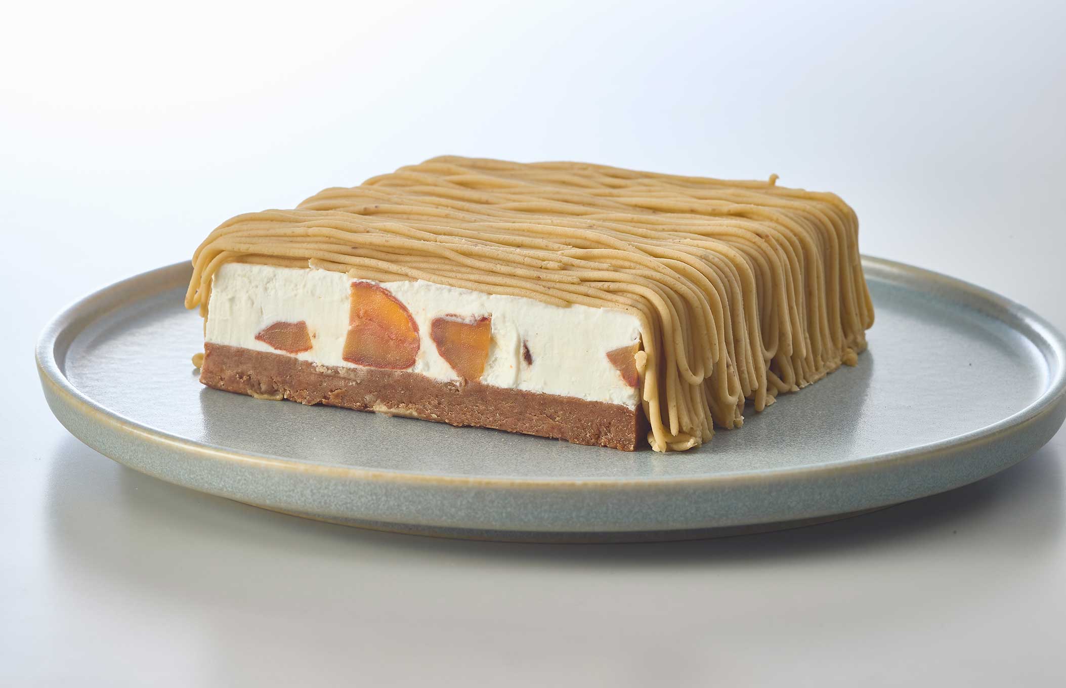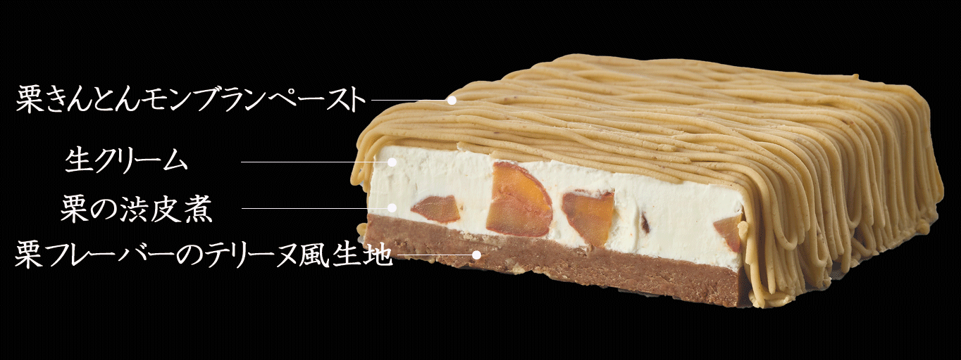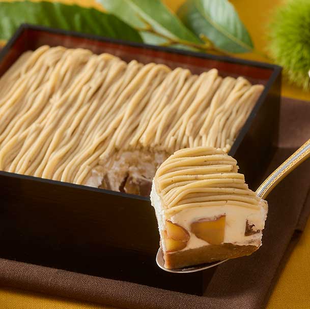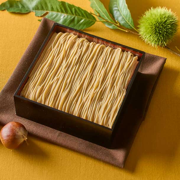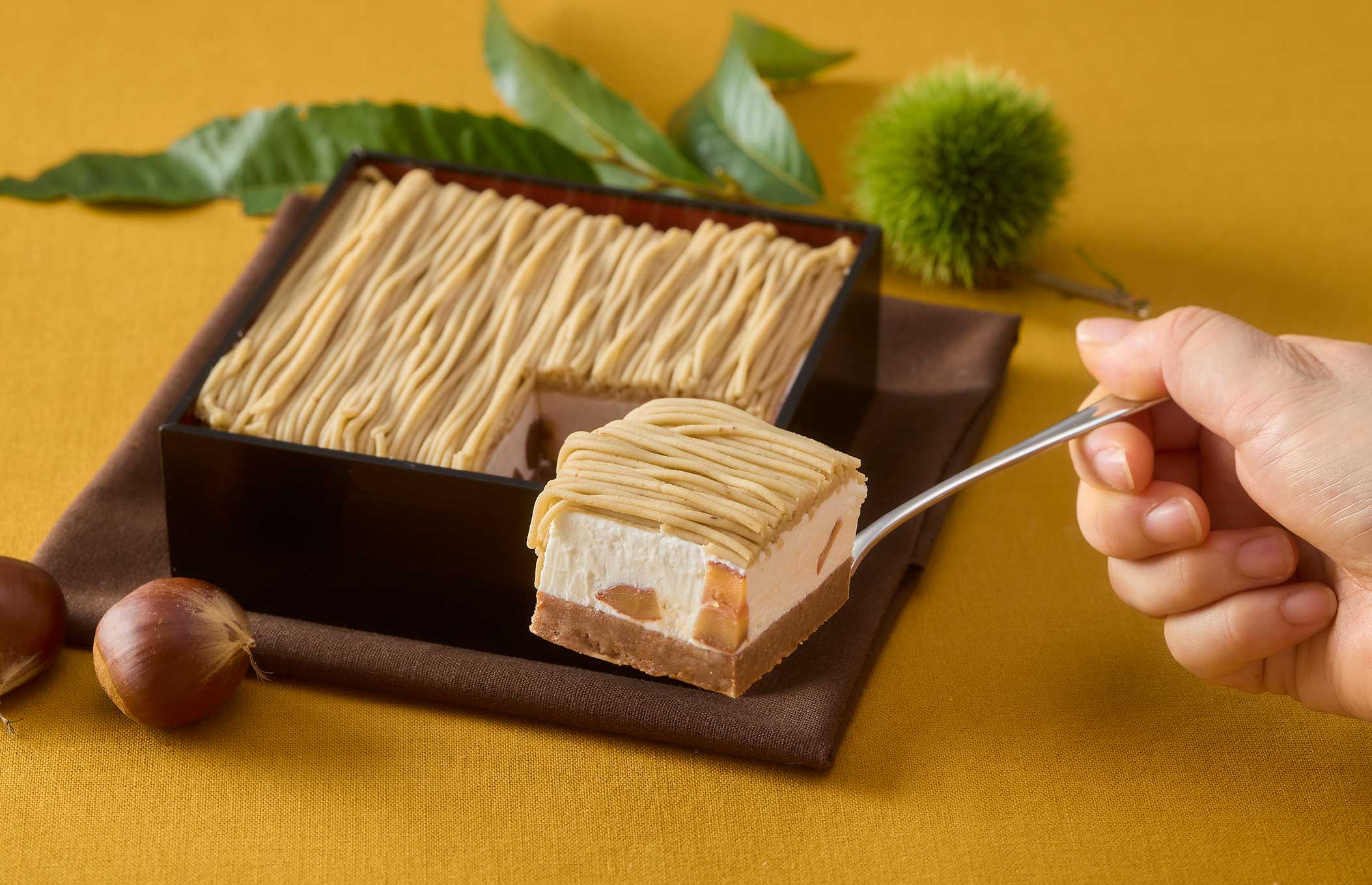 和栗の繊細な風味を生かした栗きんとんペースト(モンブランペースト)は、ふたを開けた時に栗の香りが広がるようにふわり軽やかに。中にはふわふわ生クリームと栗の渋皮煮を忍ばせ、絶妙なバランスで組み立てています。土台はより栗を感じていただけるように栗ペーストを混ぜ合わせて、テリーヌのようにしっとりとなめらかな食感に仕上げました。