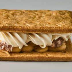 栗サブレと相性のよいブロンドチョコレートを加えたバタークリーム、さらにブロンドチョコレートを使用したアプリコットのガナッシュとセミドライ果実をサンドしました。