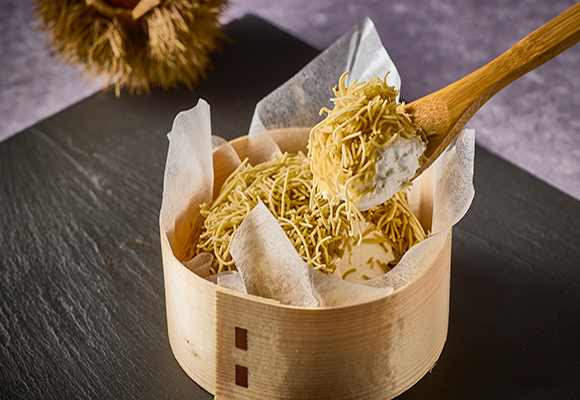 土台のタルトカップには栗の鬼皮焙煎粉を練り込み、香ばしい風味をプラスしています。和栗と洋栗の絶妙なバランスで合わせたオリジナルペーストをたっぷりと絞り、まるごと入った栗の渋皮煮、そしてタルト生地とまさに栗づくしのモンブランです。