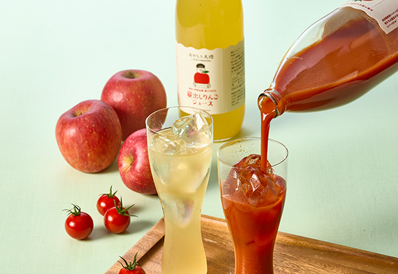 恵那山ファーム産のお菓子のように甘いトマト「フルティカ」だけを使用し、さらりと飲みやすい「おかしなトマトジュース」、南信州の山麓で栽培からこだわり大切に育てられたりんごを、園内の加工所で贅沢に絞った「蔵出しりんごジュース」を一箱に。ほっとひといき休息のおともにおすすめです。