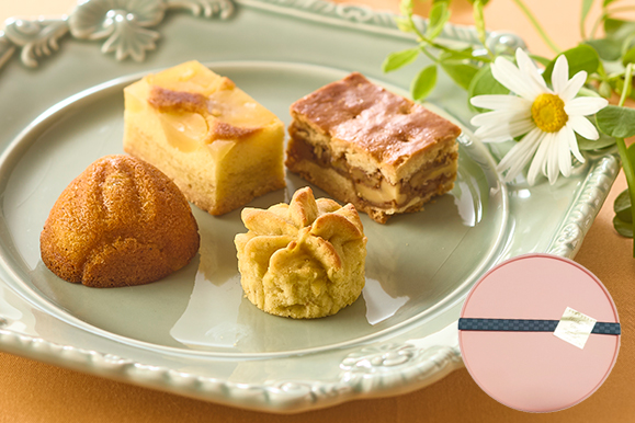 胡桃の贅沢な味わいのアンガディーネ「胡桃の散歩道」、バターや生クリームを加えて焼き上げた「洋風栗きんとん」、 栗の豊かな風味広がる「栗タルト」「栗マドレーヌ」の4種類。それぞれサイズや形状もより食べやすく工夫、個包装。