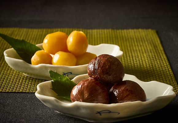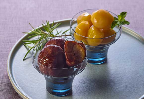 栗本来の自然な美しい色合いや風味を大切に、無漂白・無着色で仕上げた甘さ控えめの甘露煮とのセットもご用意しました。どちらも一粒でしっかりとした食べ応えのある大きさです。実り豊かな里山の秋に想いを馳せながら、珠玉の逸品をじっくりと味わってみませんか。