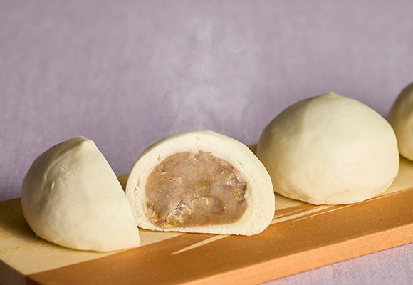 「まかない栗満寿」として販売が開始されて以来、毎朝、蒸したてをご提供する店舗で大人気。湯気とともに甘い匂いが立ちのぼり、蒸し上がるたびに次々と手に取っていただいています。