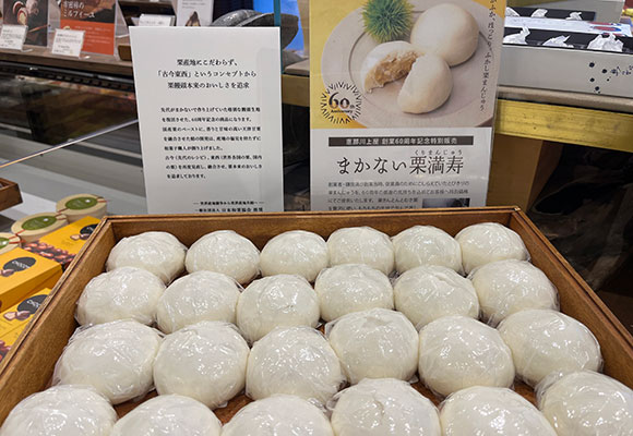 恵那川上屋の創業者、鎌田満が創業当時に「従業員を笑顔にしたい」という一心で、ともに働く仲間のためにこしらえた栗まんじゅう。中には栗きんとんと剥き栗を入れ、温かい蒸したてをおやつとして楽しみました。