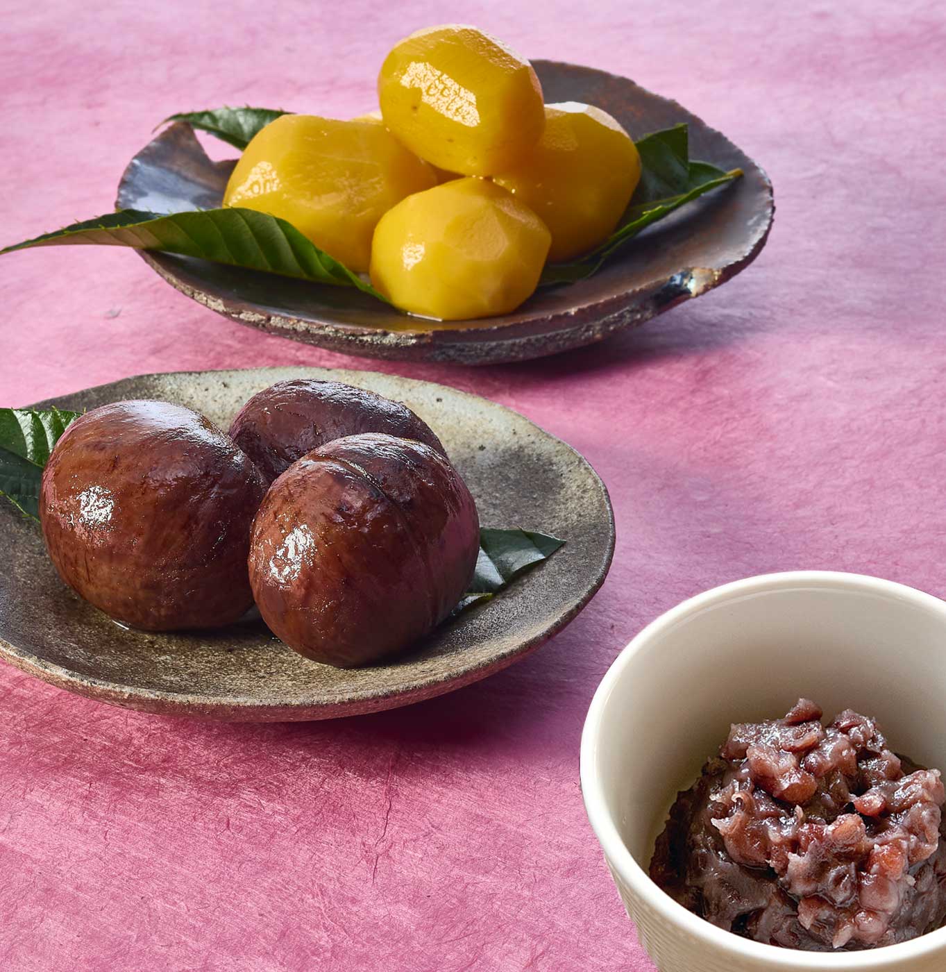 どこから切り分けても、粒よりの栗がごろごろと。そんな栗好きにはたまらない栗蒸し羊羹をお届けしたくて、通販限定商品「秋宵の香」は生まれました。しっとりとして、甘さ控えめ栗の渋皮煮と甘露煮。それぞれの持ち味をいかしつつ、見た目でも違いをお楽しみいただけるよう、異なる栗をトッピングした栗蒸し羊羹2本セットとしました。生地にもたっぷりの栗を織り交ぜています。