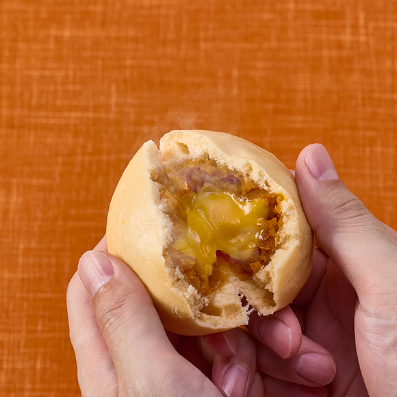 ふんわり生地には「おかしなトマトジュース」を、餡はトマトを丸ごとクラッシュして煮詰めることで、素材の甘さと旨みを凝縮!玉ねぎ・ニンニクを粗挽きのペッパーとオレガノで風味付けし、隠し味に種子島で自社製糖した黒糖を加えて味にコクと深みを出しています。中心にチェダーチーズ風味のチーズソースを包み、冷めてもやわらかく口あたりのよい餡に仕上げました。
