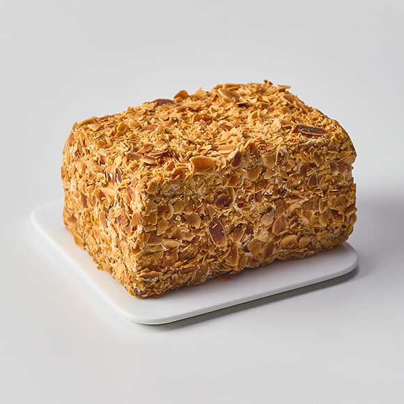 そんなパティシエールミユの想いから生まれた、ミルフィーユ仕立てのバタークリームケーキです。 ラム酒がほのかに香るコーヒーバタークリーム、洋栗ペーストを使い大人な味わいに仕上げたマロンガナッシュを、しっとりとして口当たりのダクワーズ生地で挟みました。生地には自社製焙煎栗粉・ヘーゼルナッツパウダー・アーモンドパウダーをふんだんに使用。クラッシュしたクルミも入れ、じっくりと時間をかけて香ばしく焼き上げています。食感のアクセントとして周りにアーモンドスライスをちりばめ、パイ生地のクラムのような雰囲気を演出。ほんのりビターで洗練された味わいをお楽しみください。