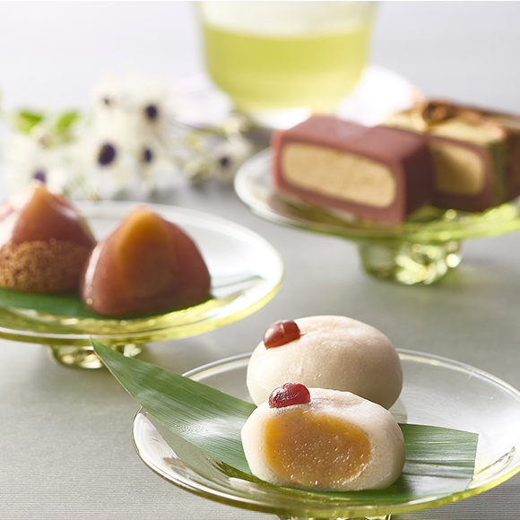 もちもちの生地の中に、夏でもさらっとお召し上がりいただけるよう工夫した、口どけなめらかな栗きんとんをしのばせました。口の中でとろける食感とやさしい栗の甘味をお楽しみください。