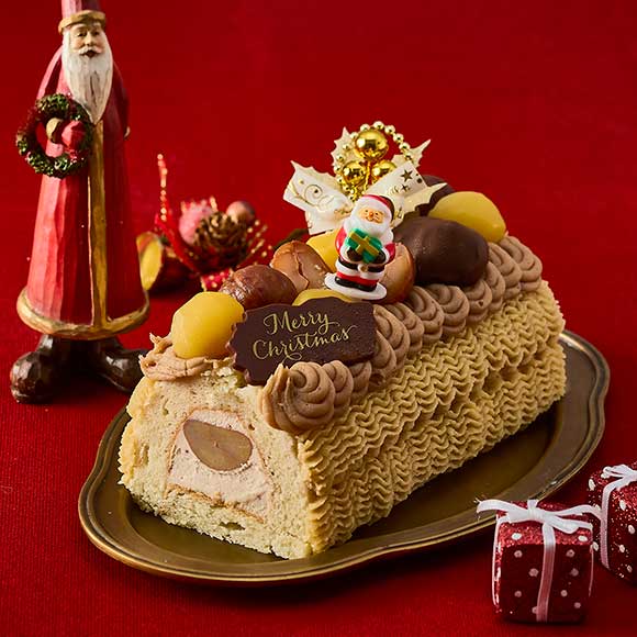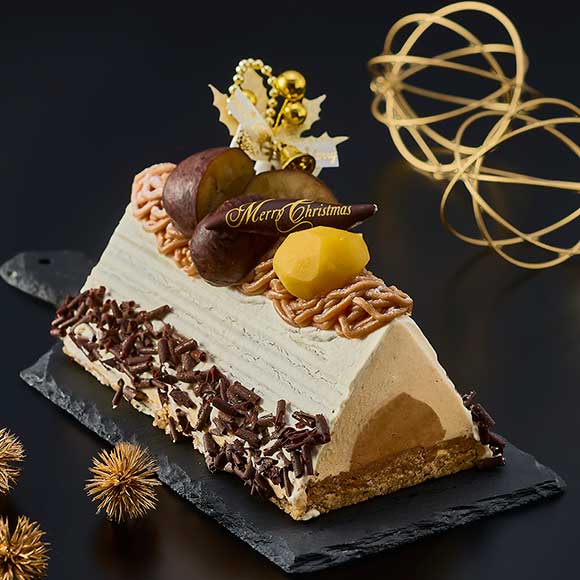 栗の渋皮煮と栗のムースをダクワーズ生地で優しく包み、栗きんとん、甘露煮、渋皮煮、ちょこきんとん、和栗ペースト、洋栗ペーストを飾りつけた栗尽くしの贅沢ケーキです。